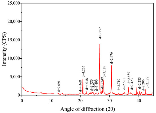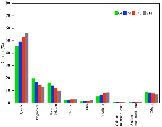 The core was crushed and milled into powder form and the whole rock was tested using an X-ray diffractometer to analyze the experimental powder (Figure 14). The XRD test showed that the highest mineral fraction concentration in the tested core was that of quartz (45.8%). There was plagioclase feldspar (19.5%) and potassium feldspar (16.3%) among the feldspar minerals, while the other mineral fraction content values were relatively low. According to the experimental protocol, one sample of core powder from the experimental groups under different pressures was taken out of the closed container on the 7th, 14th, and 21st day. The changes in the mineral fraction content values were then determined.