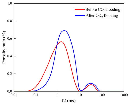An NMR test was conducted and the NMR T2 spectra of the cores were analyzed to investigate the effect of the CO2–water erosion on the pore structure. It can be observed from Figure 18 that the core with the smaller pore structure was characterized and had a very small number of large pores. The T2 spectral curve from after the carbon dioxide flooding is shifted to the right, and the relaxation time grew longer, indicating that the volume of the pores increased to a certain degree. Furthermore, judging from the magnitude of the rightward shift of the curve, the smaller pores had a stronger corrosion effect than the larger pores.
