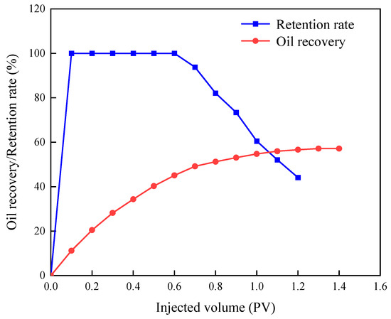 Variations in oil recovery and retention rate according to the amount of injected fluid.