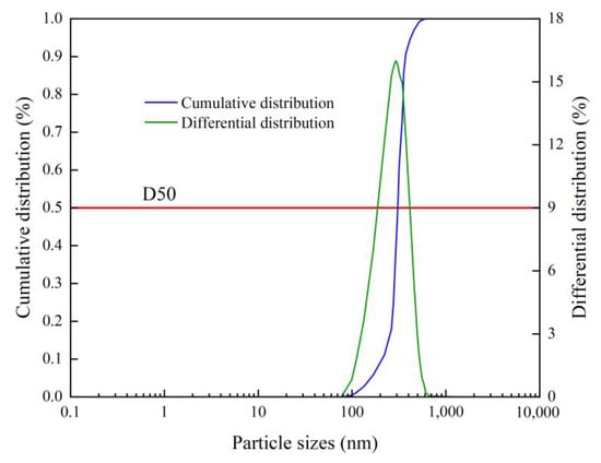 Particle size distribution curve of nano-elastic microspheres in the initial state. Blue curve represents the cumulative distribution of microspheres. Green curve represents the cumulative distribution of microspheres. They reflect the particle size distribution of microspheres in kerosene.