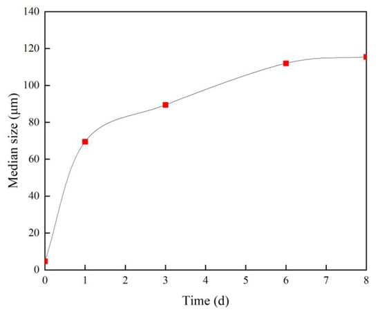 Nano-elastic microspheres. The main components of the nano-elastic microspheres used in this study consisted of acrylamide, N,N-methylene bisacrylamide, ammonium persulfate, and sodium bisulfite. Prepared through reverse microemulsion polymerization, these microspheres were stored in kerosene, with an initial particle size of approximately 300 nm. Figure 1 illustrates the particle size distribution, and Figure 2 displays the curve of the particle size of the nano-elastic microspheres in Yan5 formation water. Following a 6-day submersion in formation water, the nano-elastic microspheres underwent maximum expansion, with the particle size reaching up to 115.4 μm.