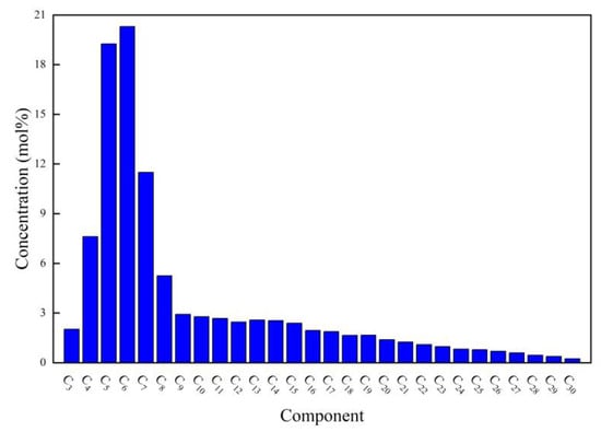 Liquid. Both dead oil and formation water were retrieved from the Yan5 layer in the Ordos Basin. The components of the dead oil are shown in Figure 3 and Table 2. The viscosity of the oil was 1.326 mPa·s, which was used in the plugging experiments. Table 3 presents the composition and salinity of the formation water, with K+ and Na+ as the main cations and Cl− as the main anion. The salinity was 82,577 mg/L, classifying the water as CaCl2-type according to Sulin’s system. The formation water was stored in a relatively closed and anoxic environment. The simulated formation water, formulated as per Table 2, was utilized in both the plugging and NMR experiments.