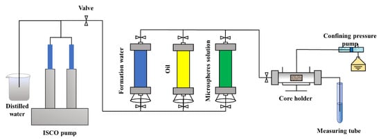 Experimental cores A-1, A-2, and A-3 were selected for the study. A-1 was saturated with dead oil, A-2 with simulated formation water, and A-3 established the irreducible water via the oil flooding method. These cores, respectively, simulated the oil layer, water layer, and oil–water transition zone in the formation. The schematic diagram of the core-plugging experiments is shown in Figure 4. The equipment included a displacement system (constant velocity and constant pressure pump (its accuracy is 0.001 mL/min), an intermediate vessel (can withstand 70 MPa), a core holder, a confining pressure pump (its accuracy is 0.001 mL/min)) and measurement system (measurement tube and pressure sensor (accuracy 0.001 MPa)). The equipment was produced by Jiangsu Tuochuang Scientific Research Instruments Co., Ltd (Nantong, China). The experimental equipment with these accuracies could effectively conduct the plugging experiment of nano-elastic microspheres. The intermediate vessel contained simulated formation water, dead oil, and a nano-elastic microsphere solution. The experimental temperature was set at 60 °C and the pressure was maintained at 25 MPa. The steps of the core-plugging experiment were as follows: