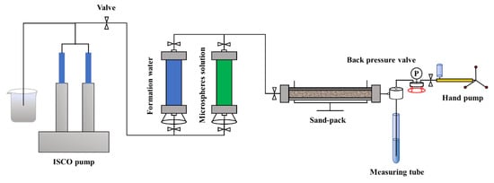 Sand-pack 1 and sand-pack 2 were filled in the same way, possessing an identical porous media structure. It was assumed that the net pressure in the fracture was 10 MPa after fracturing. Sand-pack 1 applied 15 MPa of back pressure to simulate the fracturing zone at the production well, while sand-pack 2 applied 25 MPa of back pressure to simulate the boundary of the fracturing zone. In this study, we simulated different locations of fracturing zones by applying different pressures of sand-packs to investigate the plugging mechanism. The schematic diagram of sand-pack-plugging experiments is shown in Figure 5. The experimental apparatus aligned with that used in the core-plugging experiments, with the sand-pack replacing the core holder and the back pressure system located behind the sand-pack. Back pressure was regulated with a valve and supplied using a hand pump. When the fluid pressure exceeded the back pressure, the fluid could flow out. The specific experimental steps were as follows: