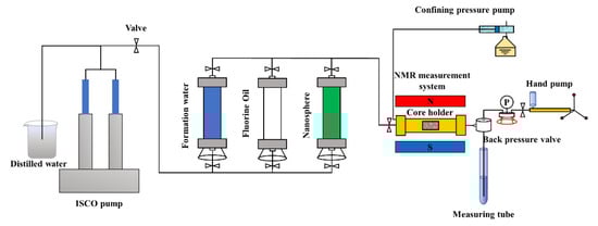 The schematic diagram of the experimental device used in this section is shown in Figure 6. The equipment included a displacement system (constant velocity and constant pressure pump with an accuracy of 0.001 mL/min), an intermediate vessel (withstanding 70 MPa), an NMR core holder, a confining pressure pump, and a measurement system (measurement tube and pressure sensor with an accuracy of 0.001 MPa) (NMR analyzer). The NMR analyzer was produced by Suzhou Niumai Analytical Instrument Corporation, Suzhou, China. The intermediate container contained simulated formation water, nano-elastic microsphere solution, and FC-40. The NMR analyzer scanned the process of fluid injection, obtaining T2 spectrums, which were then employed to explore the flow mechanism of the nano-elastic microsphere solution. The NMR analyzer utilized a permanent magnet with a magnetic field strength of 0.3 ± 0.05 T. The experimental equipment with these accuracies could effectively conduct the flow experiment of nano-elastic microspheres. The specific experimental steps are as follows: