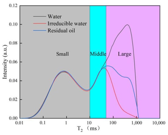 The T2 spectrum of the B-1 core in the saturated simulated formation water, irreducible water, and residual oil states is shown in Figure 9. Since the T2 spectrum of the core in these three states all showed a bimodal structure, the range between the two peaks of the T2 spectrum of the core (i.e., T2 = 10 ms) was selected in this paper to classify the central and small holes of the cores. As illustrated in Figure 9, the right peak of the T2 spectrum decreases and shifts to the left as the core transitions from the saturated simulated formation water state to the residual oil state. At locations where T2 is less than 50 ms, there are almost no changes in the spectrum. In contrast, significant changes occur in the spectrum at locations where T2 is greater than 50 ms. These results suggest that in the B-1 core, the fluid in pores with a T2 value greater than 50 ms can participate in either oil or water displacement processes. As a result, a T2 value of 50 ms serves as a criterion to distinguish between middle and large pores in the B-1 core. Based on the aforementioned principles, the T2 spectrum of the core, when saturated with simulated formation water, was analyzed and calculated. The volume distribution of large, medium, and small pores in the B-1 core was 50.32%, 13.17%, and 36.51%, respectively. The criteria for pore categorization and the results are presented in Table 6.