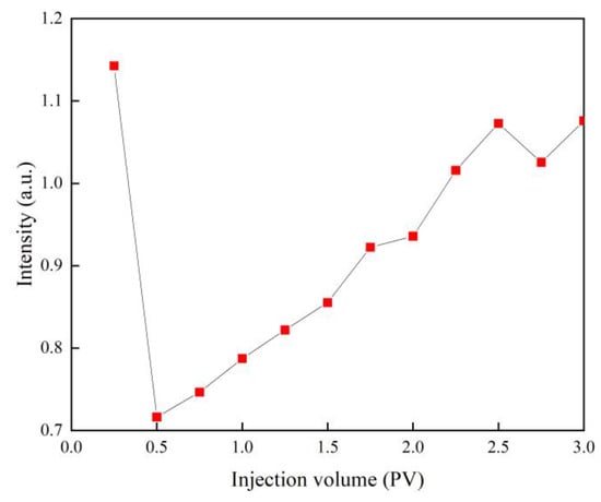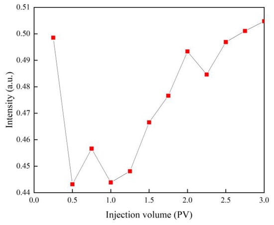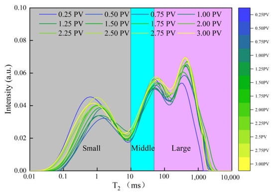 In order to better explore the injection performance of the nano-elastic microspheres in the matrix, the T2 spectrum of nano-elastic microspheres injected at 0.5PV and 3.0PV was compared with the T2 spectrum of residual oil states (Figure 16). When the nano-elastic microspheres were injected at 0.5PV, the total intensity of the small and middle-sized pores reached the minimum before continuously increasing. The strength increase after the 0.5PV injection was caused by the entry of the nano-elastic microsphere solution into the small and middle pores. Therefore, the T2 spectrum for the 0.5PV and 3.0PV injections can be compared to explore the fluidity of nano-elastic microspheres in small and middle pores. The total signal strength in the large pores showed an upward trend. Therefore, the T2 spectrum in the initial state (residual oil state) and the end state of the experiment (the injection of nano-elastic microspheres at 3 PV) could be compared to explore the fluidity of the nano-elastic microspheres in the large pores. The variations in total intensity in the small, middle, and large pores are shown in Table 7. The T2 spectrum intensity change in the small pores was 0.359, accounting for 49.18% of the total intensity change. The intensity changes in the T2 spectrum in the middle pores was 0.06, accounting for 8.22% of the total intensity change. The intensity change in the T2 spectrum in the large pores was 0.311, accounting for 42.60% of the total intensity change. The 100 nm elastic microspheres exhibit effective fluidity within the Jurassic strata and can penetrate small, middle, and large pores. However, nano-elastic microspheres predominantly tend to accumulate within the small pores.