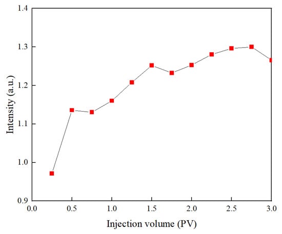 The analysis of peak strength variations within the small, middle, and large pore sections of the core is quantitatively presented in Figure 12, Figure 13 and Figure 14. Before the injection of 0.5 PV, the total intensity of the small pore channel exhibited enhancement. Notably, the nano-elastic microspheres exhibited a preference for entering the large pore channel. Following the injection of 0.5 PV, there was an increase in the total intensity of both middle and small pore channels. Nano-elastic microspheres were observed to enter the middle and small orifices after 0.5 PV injection. The peak intensity in the middle and  small pores decreased, while the peak intensity in the large pores increased, when nano-elastic microspheres were injected with 0.5 PV. Before the B-1 core was injected into the nano-elastic microspheres, the large pore contained a lot of fluorinated liquid and the middle and small pores contained a lot of water. A decline in the peak intensity of the middle and small pores suggests a transfer of the fluorinated liquid from the large pores to the middle and small pores. Following the 0.5 PV injection, there was a gradual increase in the peak intensity for the large pores, with a concurrent rise in the middle and small pores. This trend can be attributed to the obstruction of the nano-elastic microspheres within the large pores, leading to an accumulation of the microsphere solution therein. Consequently, the resultant pressure prompted the microspheres to deform and infiltrate the smaller pores. The flow dynamics of the nano-elastic microspheres are shown in Figure 15.