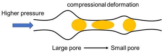 As a profile-controlling agent, polymer microspheres effectively decrease the water cut by plugging high-permeability channels [,,,,]. The intricate flow dynamics within porous media necessitate a comprehensive understanding for the future application of deep profile control technology [,]. Polymer microspheres induce resistance via complete, single, and bridge plugging, causing deformation and additional resistance [,]. The flow modes can be categorized as smooth pass, elastic plugging, and complete plugging based on the compatibility coefficients between the particle and pore geometry [,]. When the width of the throats ranges from 3 to 7 times that of a particle, the microspheres enter the pores and coalesce, resulting in bridge plugging [,]. Subsequent fluids then fail to navigate past the blockage, diverting instead towards paths of least resistance [,,].