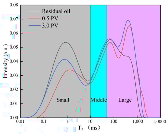 T2 spectrum at the states of residual oil, 0.5 PV injection, and 3.0 PV injection. The gray part represents the small pores, the blue part represents the middle pores, and the purple represents the large pores.