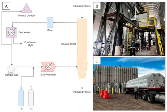 The GISH project pilot plant is located at the Hazen Research Inc. campus in Golden, CO. Figure 1A shows a simplified process schematic of the GISH pilot plant. Data for two different operation scenarios are reported in this study at a steady state, as shown in Table 1. To operate the pilot plant, H2 gas from the tank trailers is first fed into the gas preheater, which heats it from room temperature to the target temperatures at the reactor inlet, as shown in Table 1. The heated gas is then fed into the reactor shaft via a bustle located between the bottom of the reactor and the pellet cooling bustle as shown in Figure 2A,B. H2 travels in the opposite direction to pellets from the bottom of the reactor pellet bed to the top while reducing the iron ore pellets. External heat is supplied to the reaction zone in the reactor shaft by three electrical heating zones to provide the external energy necessary for the endothermic H2—iron oxide reduction reaction. The hematite pellets are fed at the top of the reactor at a rate of 21.4 kg/h, and the reduced iron pellets are obtained at the bottom, as shown in Figure 2A,B. The off-gas containing H2O and H2 at the top of the reactor is sent to a filtration unit, which removes dust and fines from the gas mixture. The filtered gas is then passed through a condenser to remove the moisture. The remaining H2 is then recycled into the feed using a compressor. Excess H2 from the condenser is burnt off using a thermal oxidizer.