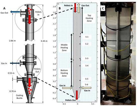 The reactor with a 0.254 m inner diameter and 2.9 m inner height consisted of three heating zones as shown in the model geometry in Figure 2A,B. The temperature of the bottom, middle, and top heating zones was set to the temperature shown in Table 1. If the temperature at coil sensors was higher than the set temperature, no external heating was provided. The temperature of the pellet bed was measured using six sensors placed at 1.02 m (S-1), 1.27 m (S-2), 1.78 m (S-3), 2.03 m (S-4), 2.54 m (S-5), and 2.79 m (S-6) from the top, as shown in Figure 2B.