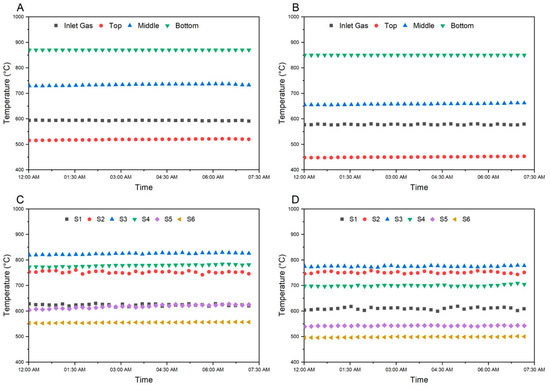 Temperature vs. Time of Inlet gas and heating coils for (A) Scenario 1 and (B) Scenario 2; Temperature vs. Time of Sensors inside the reactor for (C) Scenario 1 and (D) Scenario 2.