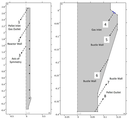 For the 2-D axisymmetric model, vertices of the geometry were defined in terms of height and radial distance from the center. The model geometry was built using the rectangular shape of width 0.254 m and height 2.743 m for the reactor shaft (real dimensions), and the gas inlet bustle was built using line segments. The entire geometry was merged to form a union using the Boolean function in the geometry interface. The walls of the reactor were divided into three equal parts to represent the external heating coils, as shown in Figure 2. Six points were defined inside the reactor to represent the temperature sensors placed inside the reactor: S-1 (1.02 m from top), S-2 (1.27 m from top), S-3 (1.78 m from top), S-4 (2.03 m from top), S-5 (2.54 m from top) and S-6 (2.79 m from top). The changes in distance from the top due to the thermal expansion of the rod with sensors are assumed to be negligible. Figure 4 shows the domain and boundaries of the 2D-axisymmetric model.