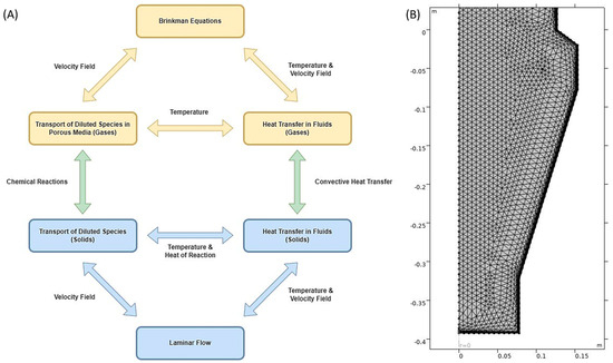 (A) Visualizing the overall model and the variables connecting COMSOL interfaces and (B) Meshing of the 2D-Axisymmetric model of the GISH reactor.
