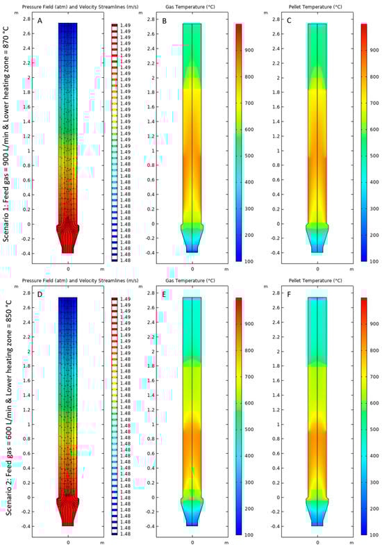 (A,D) Pressure field and velocity streamlines of gases, (B,E) Temperature of Gases and (C,F) Temperature of Pellet bed for Scenarios 1 and 2, respectively.