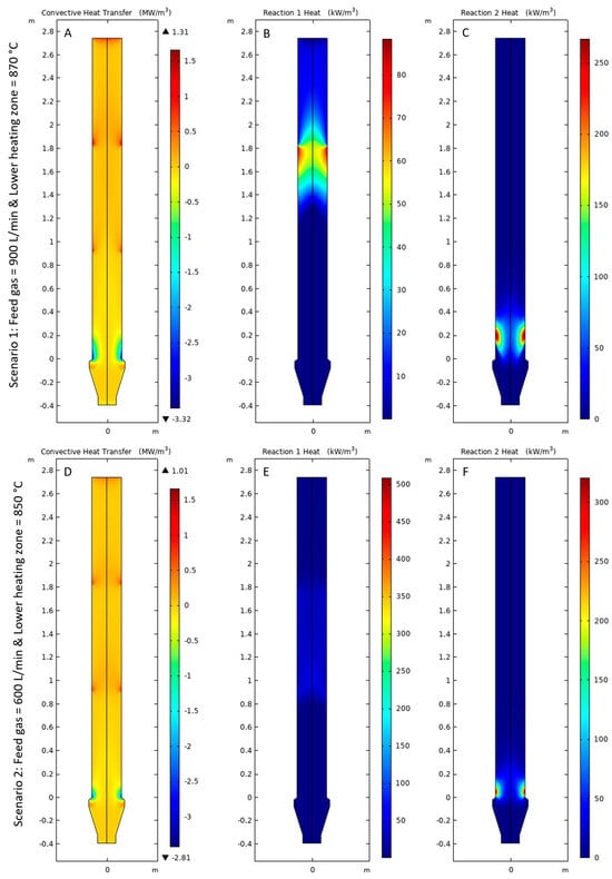 (A,D) Convective heat from gas to pellets, (B,E) Reaction 1 heat and (C,F) Reaction 2 heat for Scenarios 1 and 2, respectively.