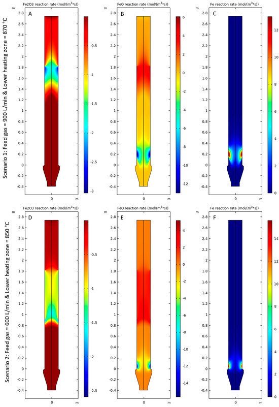 (A,D) Rate of consumption of Fe2O3, (B,E) rate of formation and consumption of FeO, and (C,F) rate of formation of Fe for Scenarios 1 and 2, respectively.