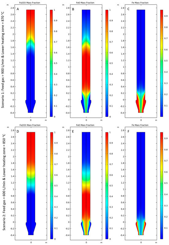 Figure 9A–C shows the mass fractions of all the solid species for Scenario 1 and Figure 9D–F for Scenario 2. Fe2O3 was observed mostly in the upper region of the reactor for both Scenarios 1 and 2, as shown in Figure 9A,D, respectively. FeO was observed in the middle and lower region of the reactor as per Figure 9B,E; while Fe was mostly observed in the lower region of the reactor and the gas inlet bustle as shown in Figure 9C,F. The mass fraction profiles, and the transition gradients can be correlated to the reaction rates of each solid species, as shown in Figure 8A–F.