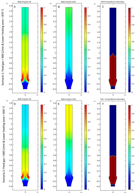 The mole fraction of H2 and H2O is shown in Figure 10A,B for Scenario 1 and Figure 10D,E for Scenario 2. The mole fraction of H2 was observed to be very high (~1) for both scenarios in the bottom of the lower heating zone near the reactor walls. As H2 travels upwards, it is consumed by the FeO to Fe reaction, forming H2O as a byproduct, which decreases the H2 mole fraction to approximately 0.6–0.7, while the H2O mole fraction increases to approximately 0.3–0.4. As H2 reaches the first reaction zone where Fe2O3 is converted to FeO, the mole fraction of H2 decreases to approximately 0.4–0.5, and the mole fraction of H2O increases to approximately 0.5–0.6 because of the consumption of H2 and production of H2O. The mole fraction of H2 decreases at a distance of about 1.6–1.8 m from the bottom of the reactor for Scenario 1, while it starts to decrease at a height of 1–1.2 m for Scenario 2 because of the higher rate of reaction in Scenario 1 compared with Scenario 2. Figure 10C,F show the Fe-FeO Baur–Glässner equilibrium profile for Scenarios 1 and 2, respectively [10]. The red color indicates the equilibrium moving forward and the formation of Fe, while blue indicates the region where the equilibrium shifts backward, forming FeO. It was observed that the equilibrium shifts backward in the gas inlet bustle for both scenarios because of a drop in temperature and a high mole fraction of H2O. The equilibrium shifted backward in both the upper and middle regions of the reactor for both Scenarios 1 and 2 because of the higher H2O mole fraction.