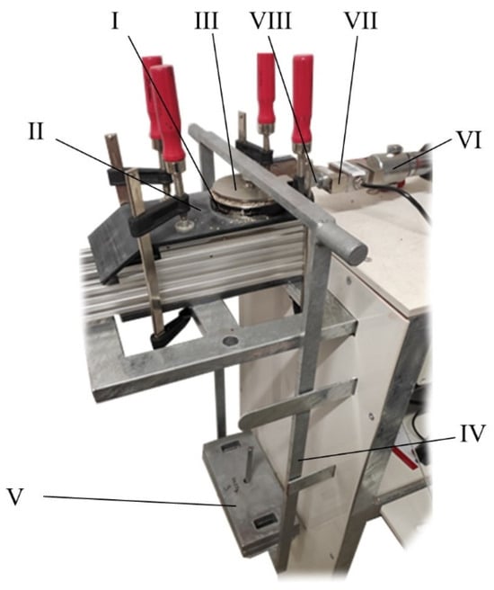 The Jenike shear tester [26,27] uses the rectilinear movement of the measuring cell with the measured bulk material to determine the shear stress between the bulk material and the friction surface (angle of external friction). During the measurement, the bulk material is loaded into the shear cell/ring (I). The cell/ring (I) is then placed on the contact material (II) (shear surface of the tool). A lid (III) is placed on the bulk material, which is placed in the cell/ring (I), and contains a spike on the top. This spike is used to place a holder (IV) on which a weight (V) is placed to apply a normal load. The piston (VI) produces a straight-line movement, which is transferred to the lid (III) and cell/ring (I) via the tensiometer (VII) and thorn (VIII). The shear stress is measured using a tensiometer (VII). The normal and friction parameters are then entered into tables and evaluated by linearizing the set of measurements and reading the angle of the linearized curve and the horizontal axis of the graph. The working speed of the Jenike shear machine used in our laboratory is v = 25 mm min−1 and the volume of the shear cell/ring is S = 6.78 × 10−3 m2. Normal tension was induced using 1–4 weights with a weight of 4.4 kg per weight.