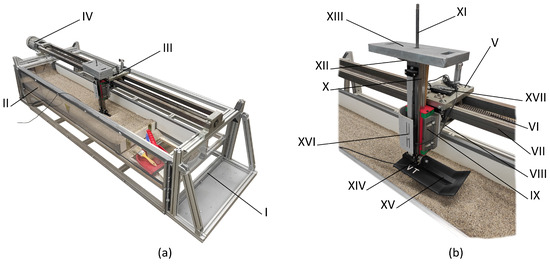 The validation system is primarily designed to provide the necessary data in the areas of material raking, material piling, material transfer and removal, and tool movement or sliding on or in a material. Figure 2 describes the validation system, which consists of a support structure (I) composed of aluminum profiles and clear polycarbonate plates, an adjustable bottom (II), a linear guide (III), and a drive (IV). The linear guide (III) consists of the travel (V), the threaded rod TR40x7 (Libor Muron PERFEKT, Ostrava, Czech Republic) (VI), and the guide rods (VII). A weldment (VIII) is attached to the travel (V) using fasteners, to which the flange carriage with ball guide HGW 45HC Z0H (HIWIN s.r.o., Brno, Czech Republic) (IX) is attached in the same way. The T-rail HIWIN HGR45T-0364 (HIWIN s.r.o., Brno, Czech Republic) (X) is inserted through the groove of the ball guide. A holder (XII) is attached to the head of the rail (X) by means of a rod (XI), on which a weight (XIII) is placed. A diaphragm force transducer (MEG30, 500 N, MEGATRON, s.r.o., Prague, Czech Republic) (XIV) is placed at the foot of the rail (X), on which is the skid/tool (XV). The normal load on the bulk material was set at 1–4 weights (XIII) (where one weight has a mass of 4.4 kg). In addition, a digital caliper (HMB Machines, Moordrecht, The Netherlands) (XVI) is attached to the device, where the values can be read from the panel (XVII), which is located on the travel (V). The drive (IV) is started using the Sinamics G110 AIN frequency converter.