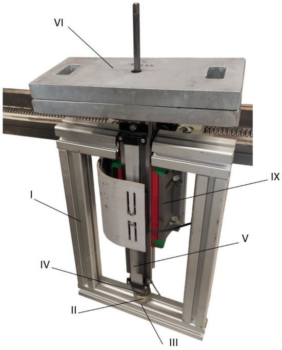 For accurate measurement values, it was important to determine the individual weights of the components in the unfolded state (Mettler Toledo PG5002-SDR scale, Greifensee, Switzerland), as well as the weight of the overall assembly as a dynamic system. The actual weight of the dynamic motion was determined using a gauge created for this dynamic motion (Figure 5). On the ball guide rail (IX), the gauge structure (I) (made of aluminum profiles) was placed for dynamic operation, to which a diaphragm force transducer (MEG30, 500 N) (II) was attached in the lower part by means of a screw (III). The dynamic effects of motion and load acting on the rail (V) are transmitted to the diaphragm transducer (II) by means of a pin (IV).