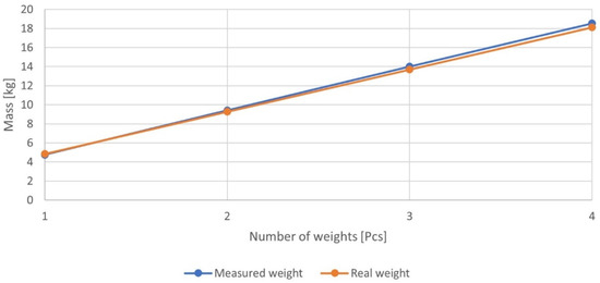 After determining these parameters, it was predicted that the dynamic motion would affect the normal load. For this reason, a device was constructed to measure the dynamic effects (Figure 5). Both the dynamic effects measurement device and the validation system used (Figure 2) contain a diaphragm force transducer. Its accurate calibration was therefore crucial to the study. The calibration was carried out through successive loading of 1–4 weights. Then, these measured parameters were compared with those weighed on a calibrated Mettler Toledo PG5002-SDR balance. A comparison of the individual values can then be seen in Figure 6, where it can be seen that the measurement inaccuracy increases as weights are added gradually, up to a maximum of 2.35% of the calibrated measurement.