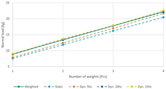 The motion of the device was dynamic. Therefore, it was checked whether dynamic shocks would not be generated when the skid moved. For this experiment, a device was created to determine the dynamic effects (Figure 5). The device sensed dynamic shocks for a defined normal load (1–4 weights) and for a defined transport speed (at frequencies of 5 Hz, 10 Hz, and 15 Hz). It was found that as the velocity of motion increased, the normal load stabilized and the absorption of the normal force exerted by the line was canceled out. After analysis, it was found that the smallest deviation in the normal load during dynamic motion (max. 1.3%) and the load weighted on the calibrated balance is at a frequency of 10 Hz. After calibration of the dynamic normal load, the device was ready.