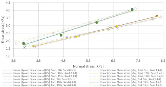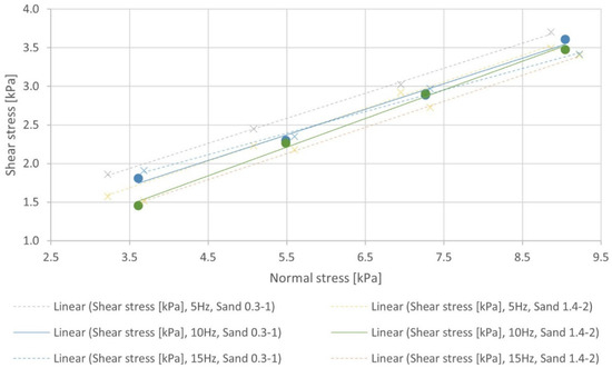 For the first set of measurements (a), the initial shear stress, the tool was placed on the soil. It was then loaded with the required number of 1–4 weights and the strain gauge was set to zero. After starting, the shear force of the tool was then read. This was carried out for three transport speeds (5 Hz, 10 Hz, 15 Hz). The parameters were evaluated, and the initial shear stress and the angle of external friction when the tool was run over the soil were determined (Figure 9). This angle was then compared with the angle of external friction, which was determined via Jenike’s method.
