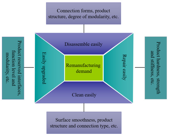 The remanufacturability demand includes easy to disassemble, easy to clean, easy to reprocess, etc., which correspond to the stiffness of the product, the strength of the component, the hardness, etc.; the details are shown in Figure 2.