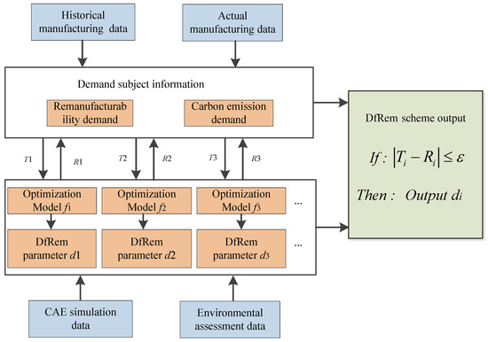 In order to improve design efficiency, product remanufacturability, and reduce carbon emissions, the optimization model of the DfRem scheme is built with remanufacturability and carbon emission, and an intelligent algorithm is applied to solve the DfRem scheme. Meanwhile, virtual verification of the product remanufacturability and manufacturing process is carried out by using physical modeling, CAE simulation, and energy consumption evaluation technologies, and the verification results are fed back to the subject demand departments, which compare and analyze according to historical physical data, and feed the analysis results to the optimization process as design objectives until the optimal design results are obtained. The detailed process is shown in Figure 3.