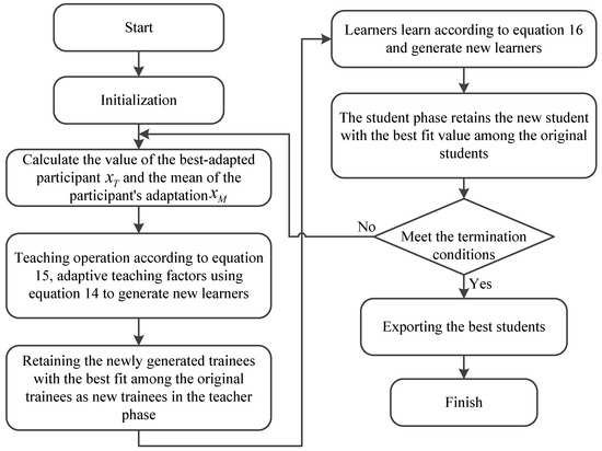 Multi-objective optimization model-solving algorithms have been developed very maturely. Commonly used examples include particle swarm algorithms, genetic algorithms, and ant colony algorithms, but these algorithms have insufficient computational accuracy and poor stability. In order to solve the limitations of previous algorithms, an adaptive teaching–learning-based optimization (ATLBO) algorithm is proposed, and the specific solving process is as follows (Figure 4).