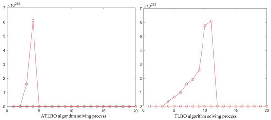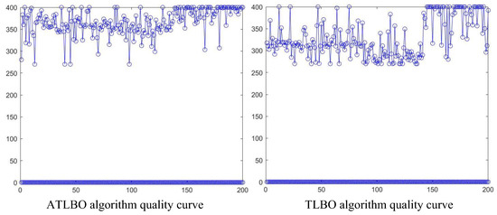 As can be seen in Figure 8, the quality values of the ATLBO solution process tend to a steady state, and the dip state tends to be smooth at the end of the iteration, while the quality values of TLBO are in a dip state and cannot be stabilized. This is because the adaptive teaching and learning algorithm continuously adjusts the learning strategy during the solution process, which can solve the objective function more stably and quickly; the solution results are shown below.