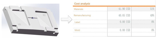 From the simulation analysis results in Figure 9, Figure 10 and Figure 11, we can obtain the manufacturing costs of the mold, the cooling effects, and the carbon emissions of the manufacturing process. The mold manufacturing cost is USD 81.95, while the cost control requirement of the manufacturer is not more than USD 100 (excluding labor, equipment, and management costs). Therefore, the total remanufacturing cost is less than the manufacturer’s expected maximum cost. Although the overall length of the cooling pipe is shorter due to the increase in the cooling pipe inlet and outlet, it can cool the molded part more directly and prevent uneven cooling, which affects the quality of the molded part, the carbon emission simulation analysis of the mold manufacturing process using the Sustainability module of SolidWorks shows that the carbon emission of the manufacturing process is 70 kg CO2, which is consistent with the manufacturer’s historical carbon emission measurement. The results of the concave mold stress simulation in Figure 12 show a maximum yield stress of 282.7 Mpa and a maximum deflection of 1.14615 × 10−5 mm at this time. By comparing the optimized mold design with the design requirements, the error value between the two is within the allowable range, and the design can be output directly.