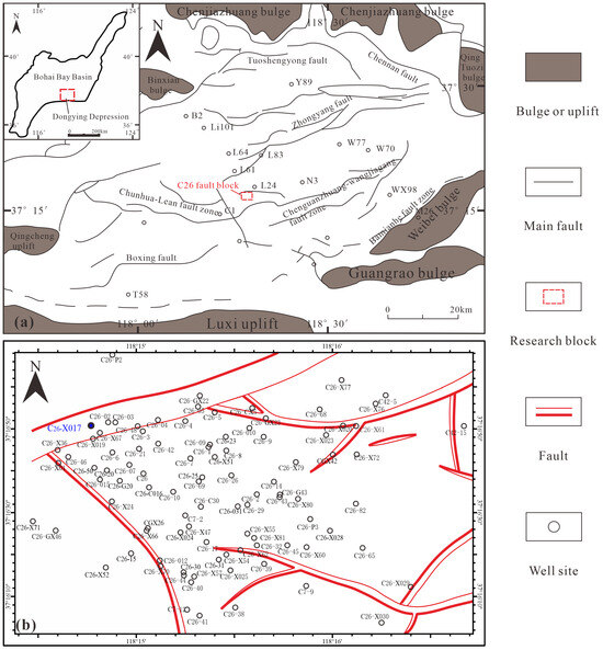 Overview of the Work Area. (a) Structural Map of the Dongying Depression Area; (b) Structural Plan of Block C26.