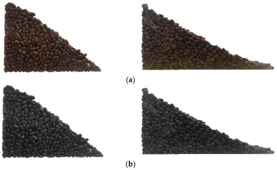 In order to avoid the influence of human measurement error, the resting angle and stacking angle are measured using computer image processing technology. After the state of the seed pile is stable, use the camera to collect the image of the seed pile, and use the MATLAB software (version R2018a) to process the image of the resting angle and the stacking angle. Firstly, use the noise reduction processing tool to obtain the original image, as shown in Figure 2a. The left side is the image of the resting angle and the right side is the image of the stacking angle. Secondly, after the processing of the original images into grayscale and binary images, as shown in Figure 2b,c, extract the features of the edge pixel points of the seed pile; the connections of the edge pixel points comprise the boundary contour curve of the seed pile. Based on the least square method, fit the boundary contour curve of the seed pile to an optimal straight line. This optimal straight line is shown in Figure 2d, in which the line’s slope is the tangent value of the actual physical resting angle and the actual physical stacking angle of seeds.