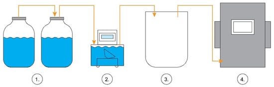 The volume of biogas from each bioreactor was monitored daily and the concentrations of methane (CH4), carbon dioxide (CO2), and hydrogen sulfide (H2S) were monitored after the 35 days of experiment. The amount of gas formed was registered with RITTER MilliGascounters (RITTER, Bochum, Germany) (2). A 20 L volume Tedlar PVF gas sampling bag (DuPont, Wilmington, DE, USA) (3) was used for biogas collection. The collected biogas was analyzed with an Awite Bioenergie GmbH AwiFlex (Awite Bioenergie GmbH, Langenbach, Germany) biogas analyzer (4). Bioreactors were stirred hourly.