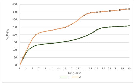 The concentration of methane in the biogas was also dependent on the inoculum used in the research. The higher concentration of methane was gained from experiment A (63.2 ± 1.5%). The biogas gained from BM in common digestate (experiment B) had a lower concentration of methane, at 54.6 ± 1.1%. This finding supports the conclusions from the experiment conducted by Zheng et al. [23], which demonstrated that a ratio of 1:5 of rumen microorganisms to biogas slurry yielded high methane production and content, thereby establishing it as the optimal ratio.