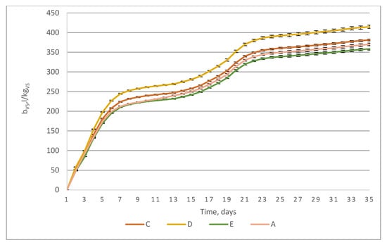 The results of the BBP experiment illustrate that the highest biogas yield was 415 ± 4.2 L/kgVS, and this result was achieved following pretreatment at 37 °C (experiment D) (Figure 3). In contrast, the biogas yield from the same feedstock composition without pretreatment was 370 ± 3.3 L/kgVS (experiment A), indicating a notable pretreatment efficiency of 12%. Statistical analysis of the data from the A and D experiments showed that there was a statistically significant difference (p < 0.05). Notably, pretreatment at 25 °C resulted in a biogas yield of 381 ± 2.3 L/kgVS (experiment C), representing only a 3% increase compared to the raw sample, emphasizing the temperature-dependent impact on the pretreatment’s effectiveness. Statistical analysis of the data from the A and C experiments showed that there was statistically significant difference (p < 0.05). Conversely, pretreatment at 50 °C (experiment E) led to a biogas yield of 359 ± 3.2 L/kgVS, indicating a slight decrease of 3% compared to the raw sample, highlighting the sensitivity of the pretreatment outcomes to temperature variations. Statistical analysis of the data from the A and E experiments showed that there was no statistically significant difference (p > 0.05).