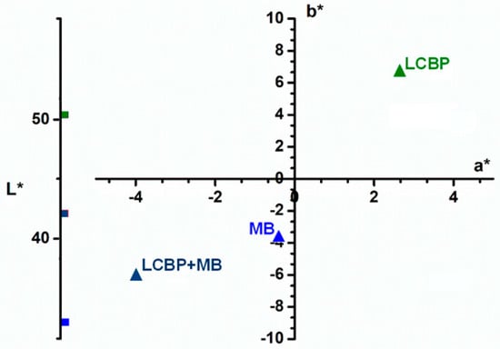 CIEL*a*b* color parameters of: MB—methylene blue dye; LCBP—Leonorus cardiaca biomass powder before dye adsorption process; LCBP + MB—Leonorus cardiaca biomass powder after dye adsorption process.