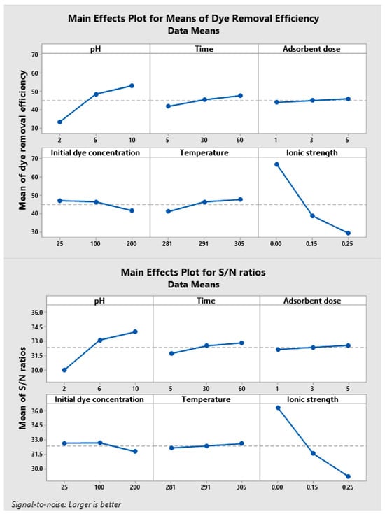 The S/N ratio response curves for the individual effects of dye adsorption parameters on the dye removal efficiency and S/N ratio.
