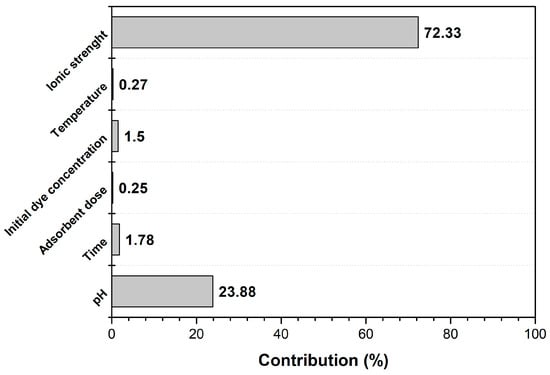 The order of controllable factor influence obtained with the Taguchi method was verified by ANOVA analysis, which also determined the percentage contribution of each factor (Figure 4). The results confirm the order of controllable factor impact obtained by the Taguchi approach. The ionic strength is the controllable factor that had the most impact on the process, while the adsorbent dose had the lowest impact.