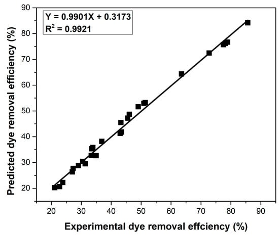 The accuracy of the predictions indicated by the Taguchi optimization method was also verified. A strong correlation between the experimental and predicted values for dye removal efficiency was observed, with the coefficient of determination (R2) value being close to 1, indicating high prediction accuracy (Figure 5).
