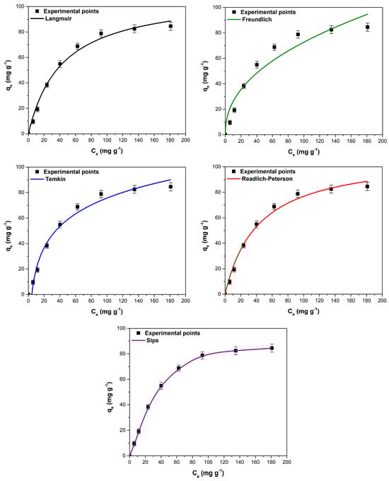 Equilibrium isotherms indicate the relationship between the concentration of solute in a solution and the amount of solute adsorbed onto the adsorbent material surface [21,22,23,24,25]. Some of the most-used isotherms to model the experimental data obtained in adsorption processes are Langmuir, Freundlich, Temkin, Redlich–Peterson and Sips. The fitted curves of these isotherms are shown in Figure 6 and their specific constant and error parameters are depicted in Table 9.