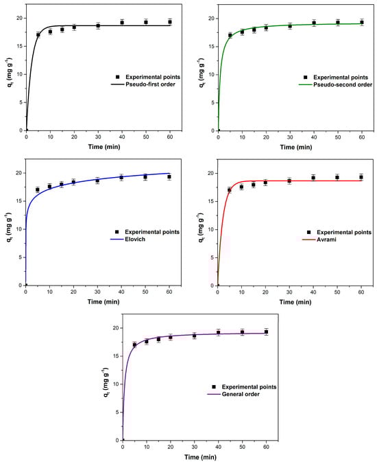 To evaluate the mass transfer rate during the adsorption process, it is crucial to use adsorption kinetic models. These patterns provide valuable information on the extent and rate of surface coverage [10,13,26,27]. Several kinetic models, including pseudo-first order, pseudo-second order, Elovich, Avrami and general order, are commonly applied in modeling experimental data from adsorption processes. These kinetic models fitted curves are illustrated in Figure 7, and Table 10 displays their specific constant and error parameters.