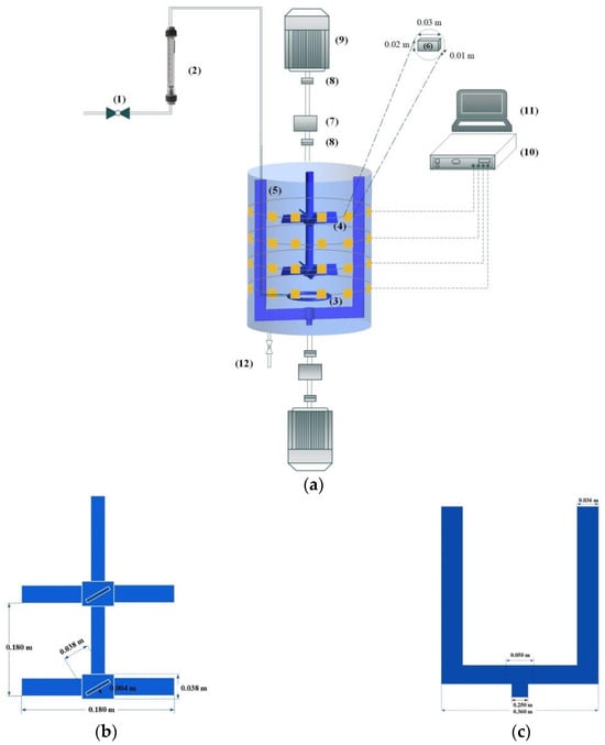 In this work, both local and overall gas hold-ups were measured experimentally using the electrical resistance tomography (ERT) approach. For this purpose, the ERT system (Industrial Tomography Systems, model P2+) was used. As shown in Figure 1, the ERT system comprises four planes with 16 stainless steel electrodes on each plane, evenly distributed around the bioreactor tank. The ERT planes were labeled by number, and their heights from the bottom of the tank were: 0.38 m for plane 1, 0.27 m for plane 2, 0.22 m for plane 3, and 0.17 m for plane 4. A current of 5 mA with a frequency of 4800 Hz was applied to neighboring electrodes, and the voltages across consecutive pairs of these electrodes were recorded. This procedure was iterated to ascertain the local fluid conductivity. To mitigate the influence of the impellers, sparger, and shafts on fluid conductivity, 50 reference frames were recorded while the coaxial mixer rotated within a xanthan gum solution before introducing air. Subsequent to air introduction, an additional 50 frames were captured to establish a steady-state condition, and an extra 100 frames were recorded to quantify gas hold-up. It is important to mention that a minimum of 100 frames is essential for generating high-resolution tomography images and precisely assessing gas hold-up in the gas–liquid coaxial mixing bioreactors. Subsequently, the acquired data were sent to a data acquisition (DAQ) system for further processing. The linear back projection method was employed to reconstruct tomograms and analyze variations in the conductivity of the xanthan gum solution after air injection. Finally, the local fluid conductivity values were converted to local gas hold-ups using the Maxwell equation [34]: