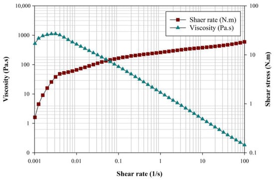 The aqueous solution of xanthan gum with a concentration of 1 wt% was employed as the working fluid. The rheological characteristics were assessed using a Kinexus Pro+ Rheometer (Malvern Instruments, Westborough, MA, USA). The rheological properties were measured using the shear rate table test at a constant temperature of 22 °C, which corresponds to the operating temperature of the experiments. Figure 2 displays the apparent viscosity and shear stress of the working fluid under varying shear rates. The working fluid exhibits shear-thinning behavior with yield stress. The rheological properties are closely aligned with the Herschel–Bulkley model for shear rates ranging from 0.1 to 100 L/s, and the corresponding model parameters are detailed in Table 1.