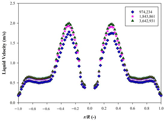 The 3D CFD modeling of the aerated double coaxial mixing bioreactor was developed using the commercial software ANSYS Fluent 2022 R1. Several studies have reported that assuming laminar flow in the transitional regime is justifiable when mixing shear-thinning fluids with yield stress [10,22]. Therefore, a laminar flow model was used in the simulations. The sliding mesh technique was employed to model the rotation of the impeller, enabling the transient simulation of the flow field. As shown in Figure 3, the fluid domain was discretized using non-uniform and unstructured tetrahedral elements. To assess the independence of the grid size on the simulation results, three distinct mesh configurations were employed in this study, consisting of 974,234, 1,843,861, and 3,642,931 mesh cells, respectively. The investigation of the impact of various mesh sizes on the xanthan gum velocity in the axial direction was carried out through simulations with three different mesh sizes: a coarse grid size (974,234), a medium grid size (1,843,861), and a fine grid size (3,642,931), with the corresponding results depicted in Figure 4. In this figure, the profiles of liquid velocity along the axial direction are depicted for three distinct grid sizes. Based on the data presented in this figure, it can be observed that the results obtained from the medium and fine grids exhibited negligible differences. Consequently, the grid with a size of 1,843,861 was chosen as the optimal mesh.