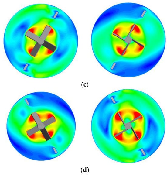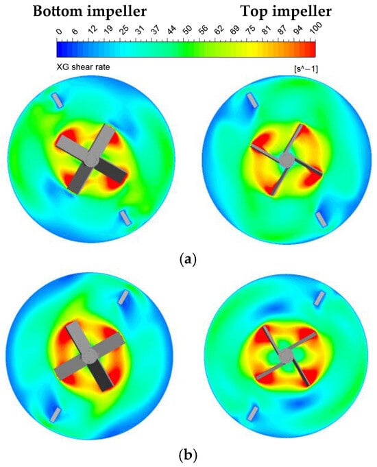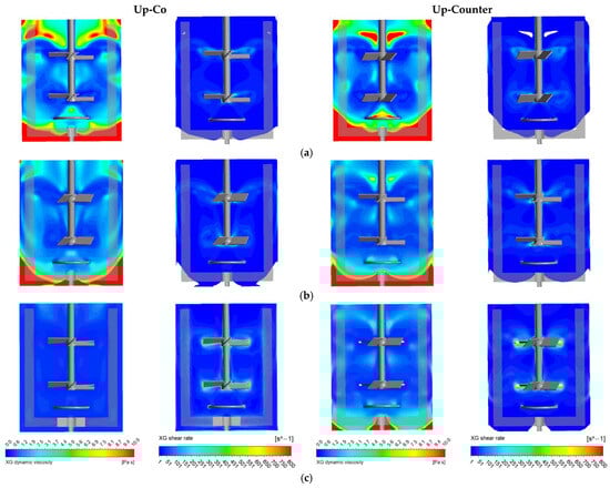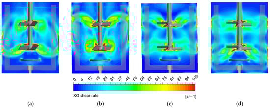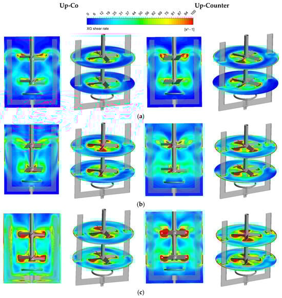 The wider red areas were observed for the Up-Co mode around the impeller blades. Additionally, Figure 5 shows the presence of more uniformly distributed medium-shear zones in the axial direction for this configuration. When comparing the downward-pumping and upward-pumping in the co-rotating mode, it is evident that in the Down-Co mode, the area of high shear rate is limited to the vicinity of the central impellers, while a more homogeneous shear distribution was observed in the Up-Co mode.